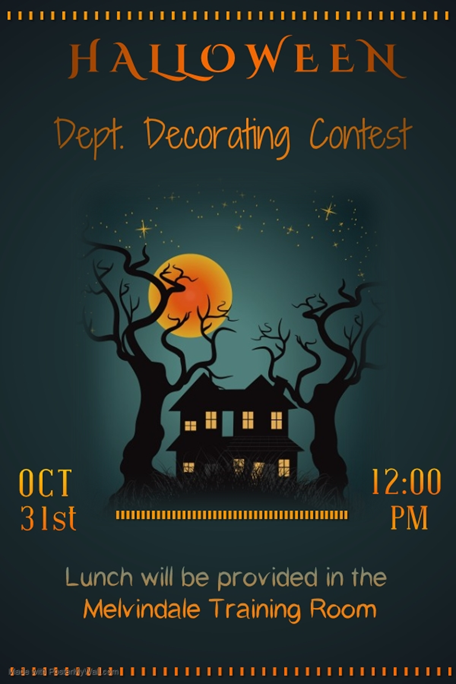 HR is hosting their annual contest for the best decorated department on Halloween day, and everyone is invited to decorate their areas for the event. So, get the bats out of the attic and the monsters out from under the bed and bring them to Evans! Have fun and be creative; we cannot wait to see what you come up with! Happy Halloween!