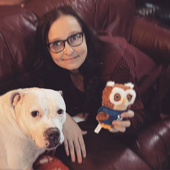 On my couch with my dog Blue. She’s an 8-year-old Staffordshire Terrier. Her personality is just like mine! She’s my big potato—we have her on a special diet now. I also enjoy volunteering at the animal shelter and spending time with my two children, 18 and 20 years-old.